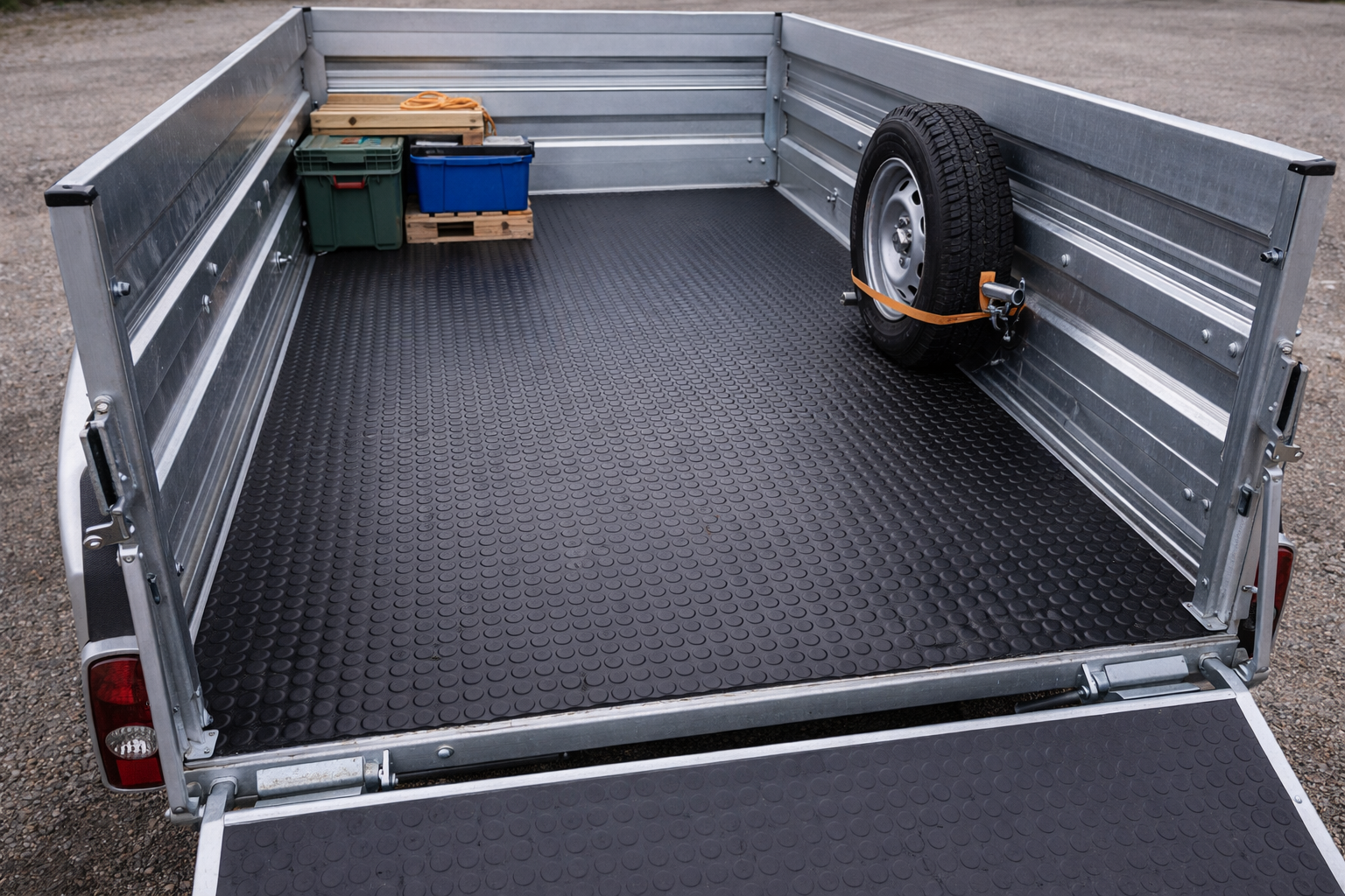 Eine hochwertige Gummimatte schafft hier eine belastbare, rutschhemmende und langlebige Oberfläche. Sie sorgt für mehr Kontrolle beim Be- und Entladen, reduziert Bewegungen der Ladung und trägt dazu bei, den Anhänger dauerhaft in einem guten Zustand zu halten.