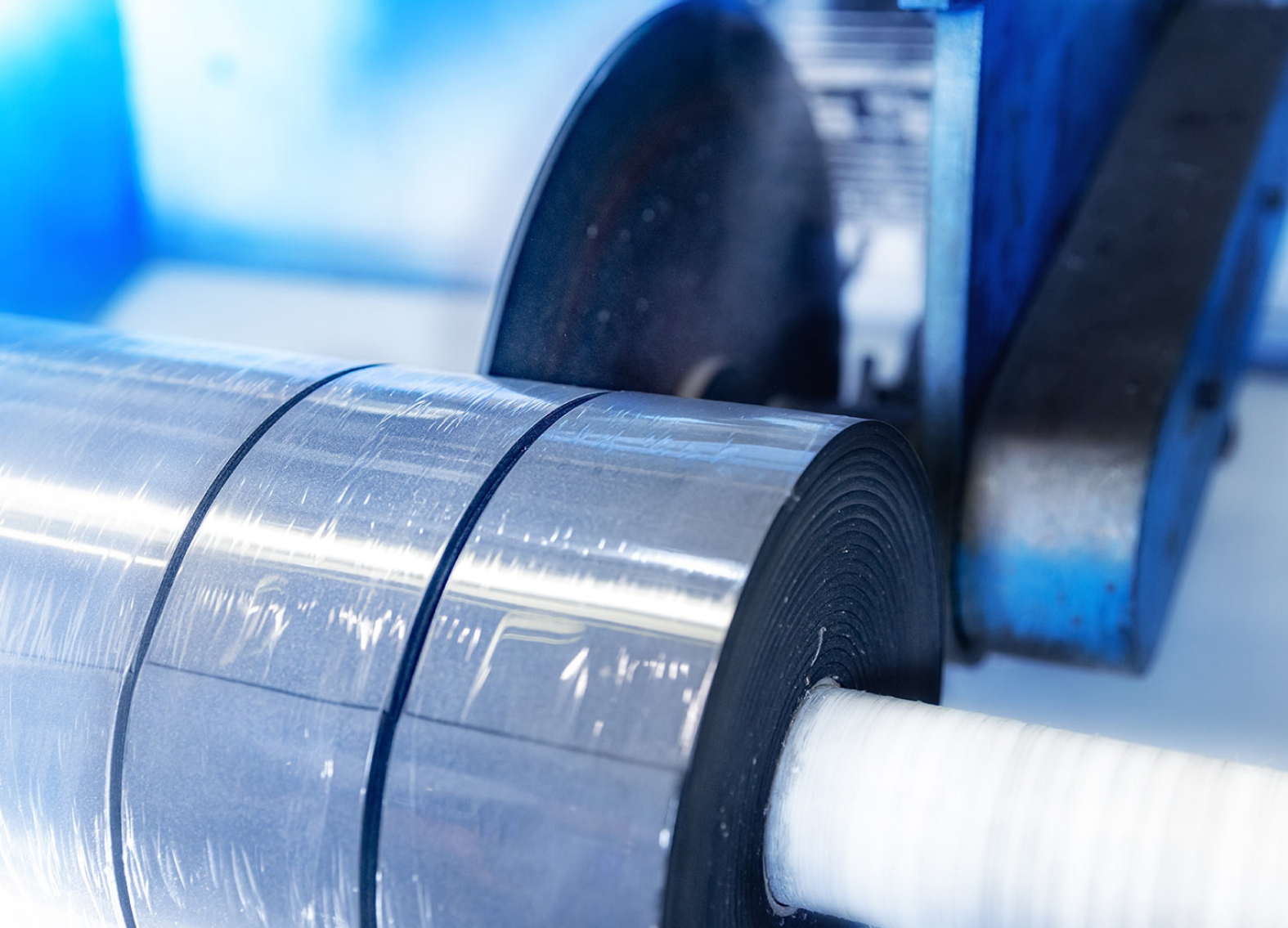 Die Streifenschneideanlage ist eine Maschine zur industriellen Fertigung, die breite Materialbahnen in schmale Streifen schneidet. Das Gummi wird von einer Rolle abgewickelt, durch rotierende Messer oder Klingen geschnitten und auf Wickelvorrichtungen aufgerollt.