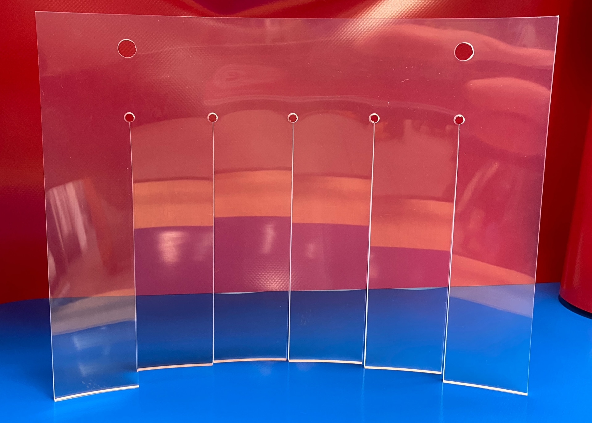 Als Rollenware, Meterware, Streifen, Lamellen Aufhängung, Vorhang nach Muster oder Zeichnung durch Plotten, individuelle Zuschnitte nach Maß verfügbar. Verfügbare Farben: Transparent/farblos, bläulich gefärbt, gelb gefärbt und andere Farben auf Anfrage.